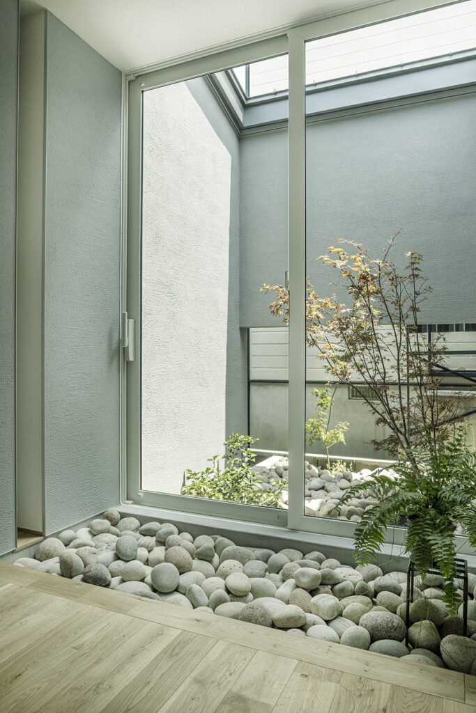 間口7m・奥行き30mの細長い敷地に、小さな中庭を計画。