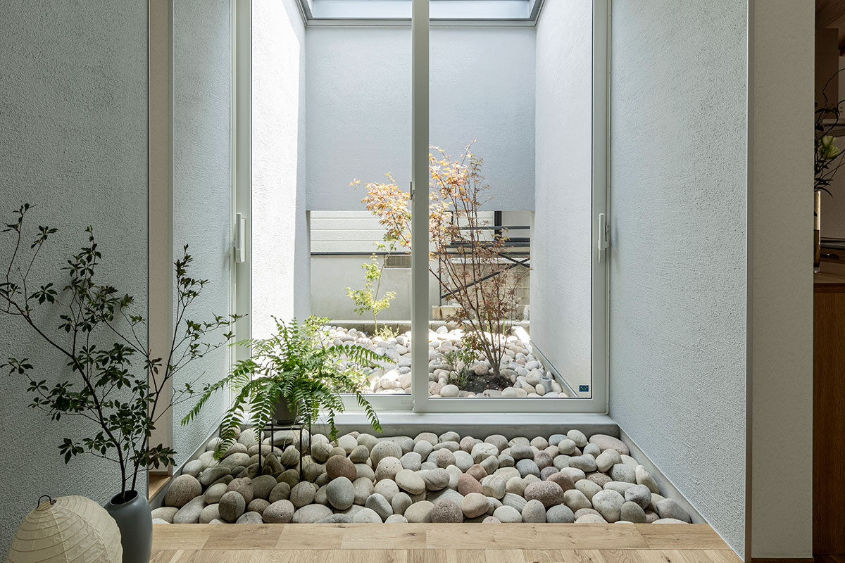 もうひとつは“つなぐ”とは反対の“はなす”ニワです。細長い敷地形状に対して条件を受け入れる形で、前面にみんなで集まる「パブリック」な空間、後方には水まわりや居室を有する「プライベート」な空間を配置しています。2つの異なる空間の間に無目的な「ニワ」があることで、パブリック/プライベートを行き来する際に、プライバシーは確保しつつ外とつながれる、あえて領域を切り“はなす”空間になっています。フローリング部分にはベンチを置いて、読書をする空間だったり、隣接する脱衣場、洗面まわりから湯上りのリラクゼーション空間だったり、多目的に切り替わる空間としています。モルタルを基調としながら屋外植栽計画の延長として、割栗石を敷き詰めている仕上げを室内まで取り込むことで外部との連続性を確保した非日常な空間に仕上がっています。