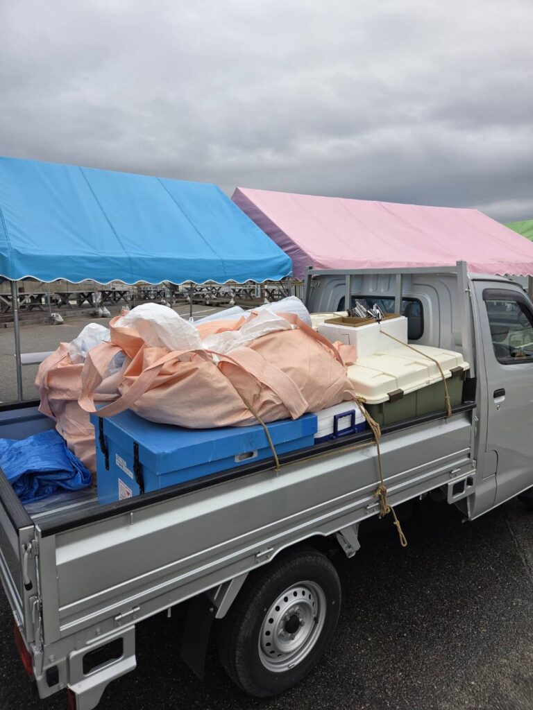 (今回のサムネは当日の土砂降りの中準備する河合社長)
