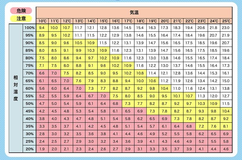 この表のとおり、湿度50%でもかなり注意!!なときと、ちょっと注意だねって感じなんですよ。