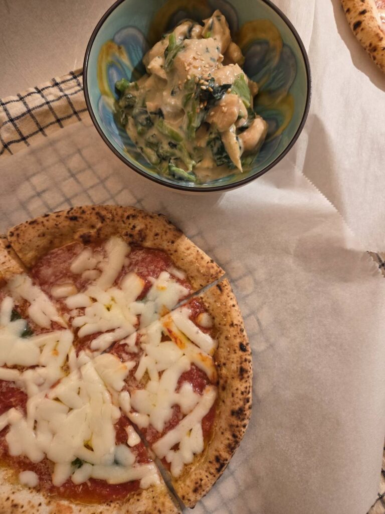 らしく、コンビニの冷凍ピザを食べました。と白和えちっくなやつ。