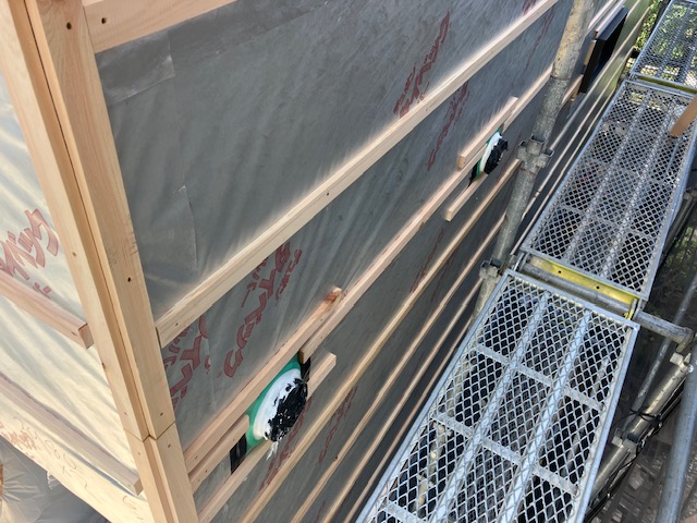 今回は外壁材をガルバニウム鋼板の4山角波を採用しています。その為、幾分工程が早くなりそうな気がします。