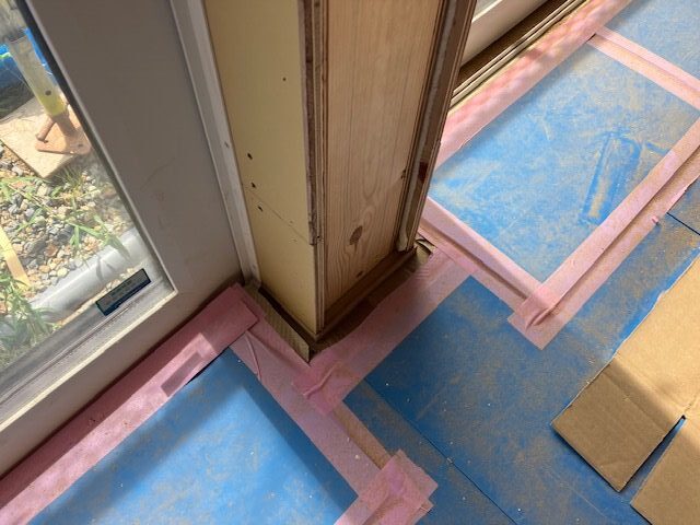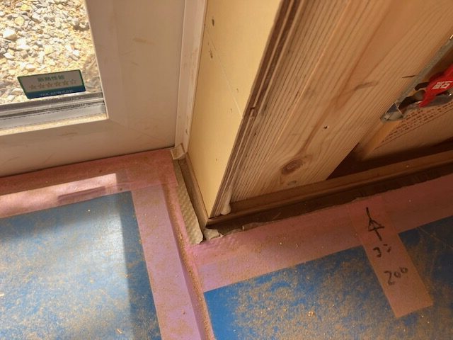 河合工務店オリジナルの木製巾木の取り付け状況。壁のプラスターボードを施工する前に取り付けます。