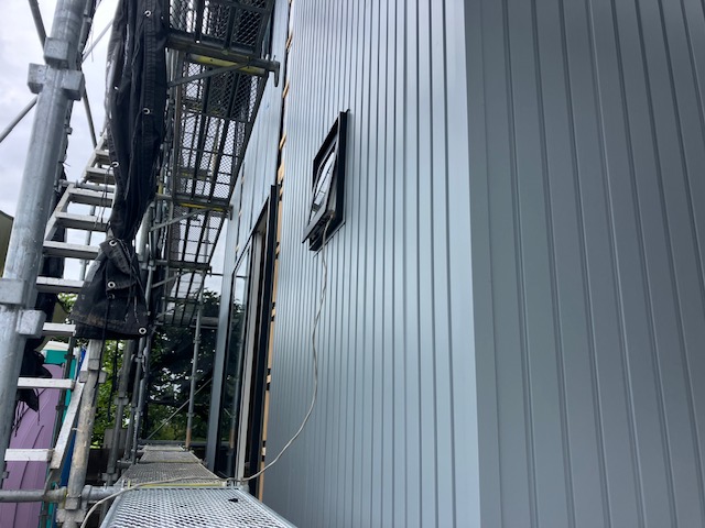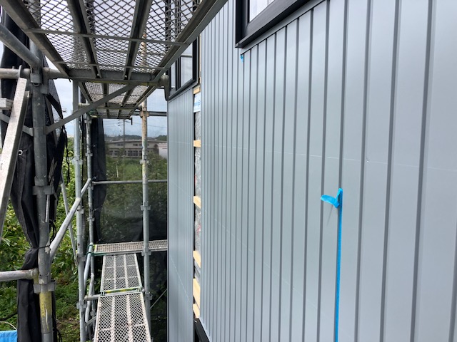 職人さんが4名入って施工しています。上から下までつなぎ目のない外壁板金材で施工しています。