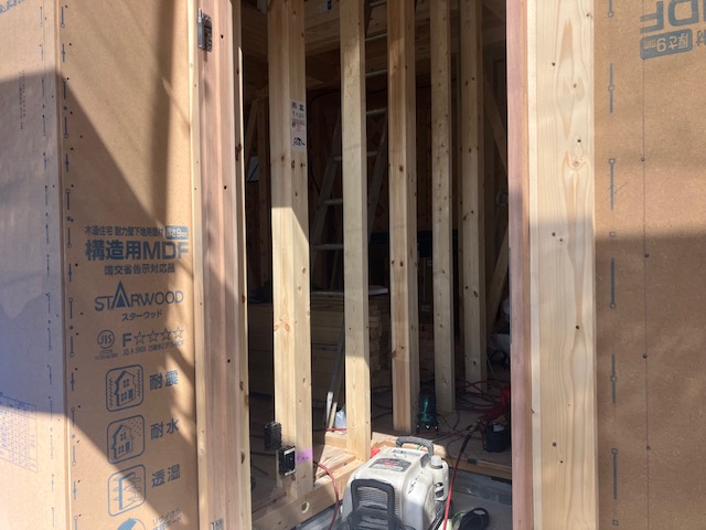 今回は玄関ドアがガデリウス製の木製断熱ドア。大工さんが外枠の取り付け完了。