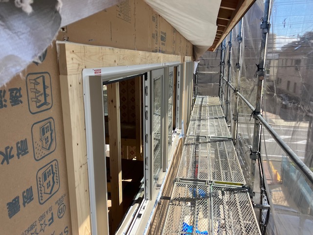 玄関ドア、樹脂サッシの取り付けが完了しましたので、明日から付加断熱工事が始まります。