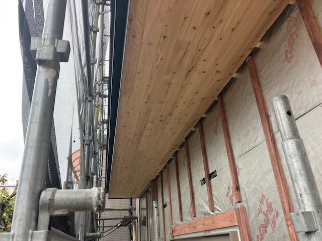 外部の軒天張り工事が完了しましたので、次の工程に進む予定。