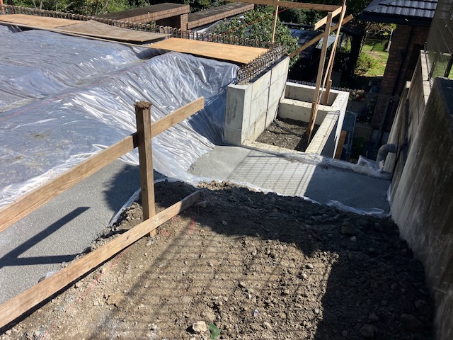 名古屋市新築工事現場では、擁壁工事が終わり基礎工事が始まりました。