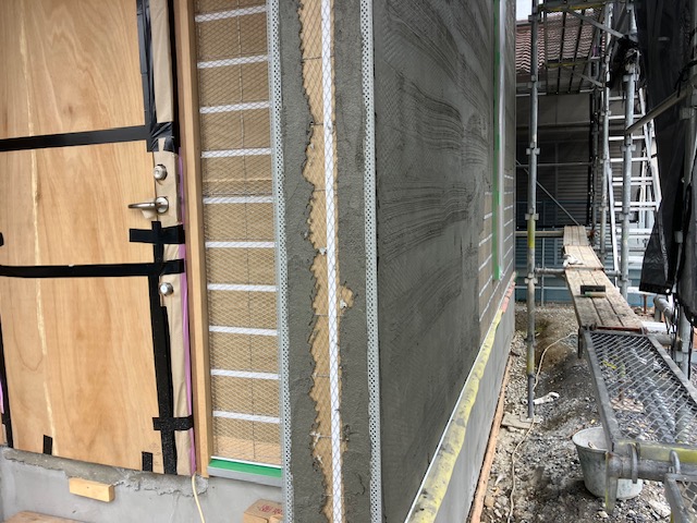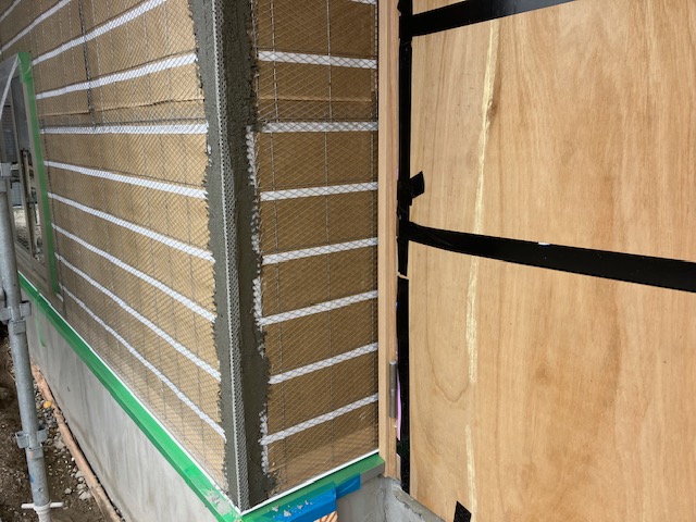 名古屋市新築工事現場では、外壁工事の軽量モルタル工事を行っています。