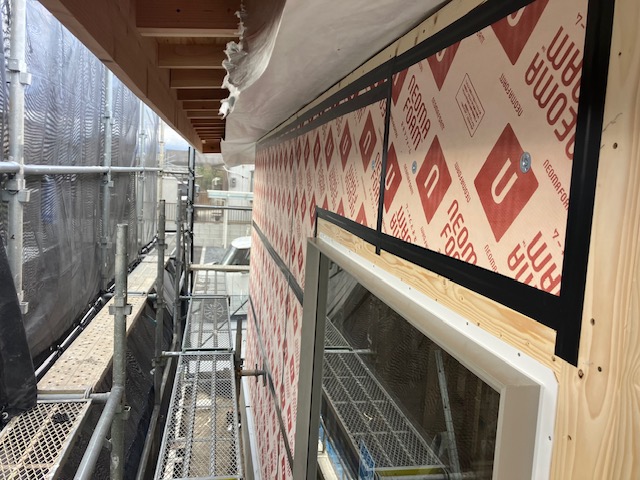 透湿防水シートを張っていきます。そして今回は金属サイディングを採用。
