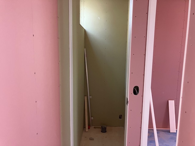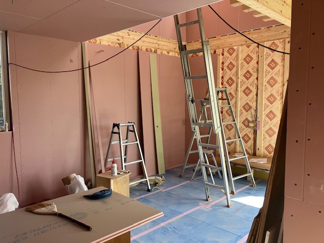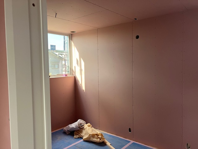 木製階段を取り付け部分を残して、プラスターボードはほぼ完了。