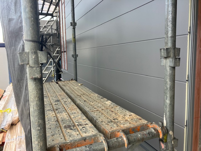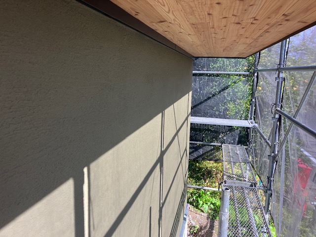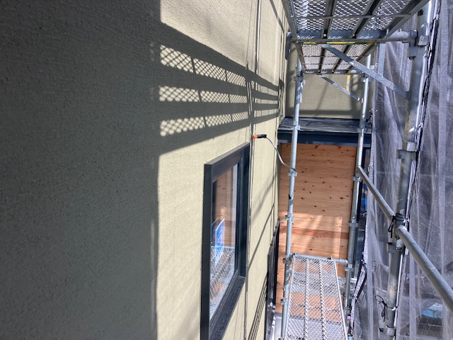 金属サイディング施工ですので、いつもより進捗具合が早め。来月上旬ごろには仮設足場を撤去できそう。