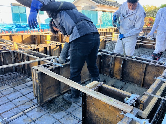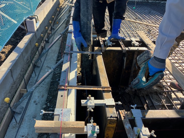 基礎コンクリートを立ち上がり部分とベース部分を同時に施工する。