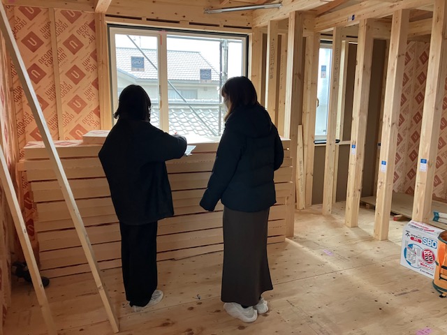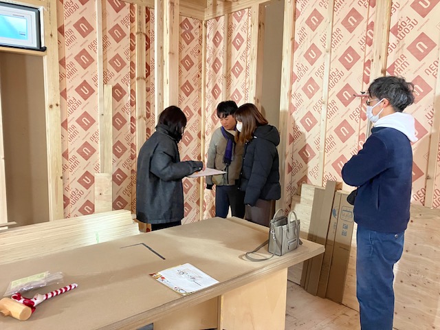 その寒い中でしたが、先週末の上棟から1週間経ちましたので、お施主様と一緒に電気工事の打ち合わせを行いました。