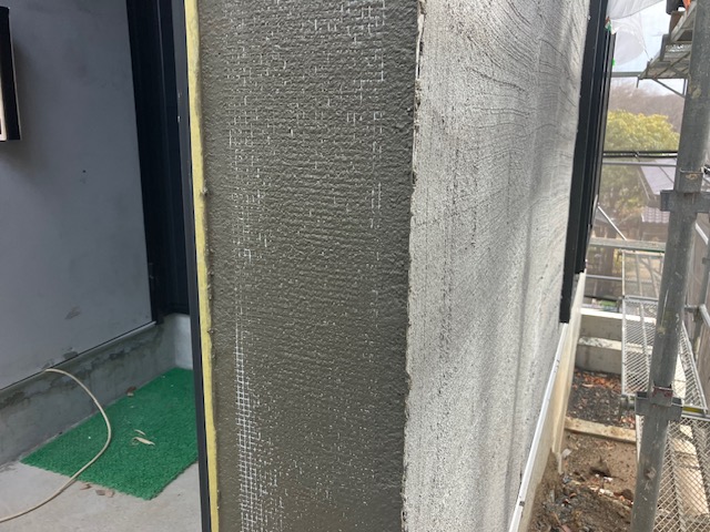 モルタルはひび割れ、クラックが入りやすい。少しでも軽減できるようにメッシュを埋め込みながら施工します。